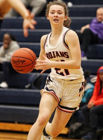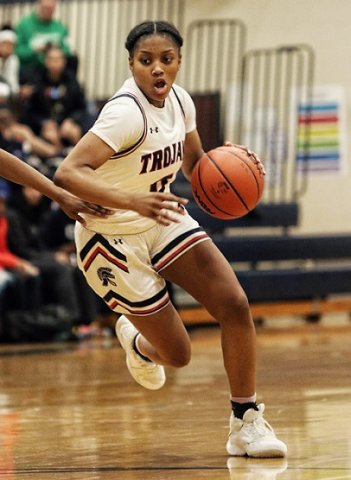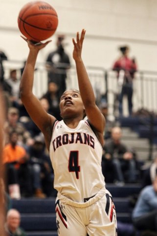Senior guard Sanaya Gregory converted 9 of 12 free-throw attempts in the fourth quarter Monday night to lead the Trojans to their 11th victory of the season. (Photos by Gary Caldwell)