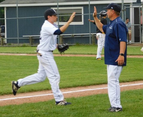 East Lansing head coach Mark Pendred congratulates Louis Booth after the last out of Saturday's win over Waverly.