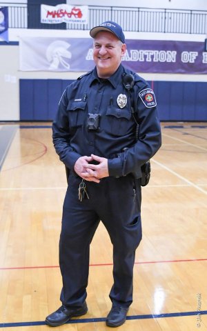 Editor's note: On February 14, 2019, Athletic Director Nikki Norris called out to the court ELPD Officer Steve Whelan to recognize him for having been named ELPD's Officer of the Year. The following photo was provided to us by Jim Pivarnik. You can read about Whelan's long service as East Lansing's school resource officer in this special profile by ELi's Ann Kammerer.