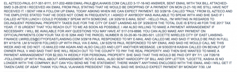 Update, August 22, 9:30 p.m.: Vlahakis indicates that some of the taxes owed to East Lansing were paid on the day this article was published, and others paid much sooner, but that the online city and county websites do not accurately reflect when delinquent payments were made. The websites confirm that information about delinquent payments is often not posted in a timely fashion.
