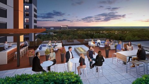 Below: A rendering of the “amenity deck” Bell and colleagues said they would build above the parking garage as part of the senior rental housing for Center City District.