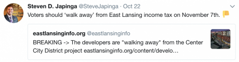 On Sunday, Japinga posted the following tweet, suggesting that because the Center City developers are “walking away,” East Lansing voters should reject the income tax proposal on November 7’s ballot: