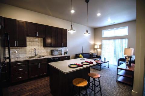 All of the residential units are two-bedroom, two-bath units with 10 foot ceilings and windows up to 8 ft tall.  All apartments include washer and dryers in the units, and Cronin estimates the average rent at $1800 per unit. That includes one parking space (an additional one can be rented for more money). The following image shows a typical apartment interior, including the high-end kitchen style, with wood cabinets and stone countertops.