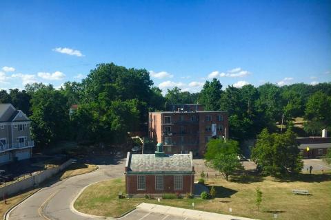 Cronin gave me a tour of the building before it was complete. From that tour, I would say the apartments are uniformly bright and modern in feel, with high ceilings, and with great views from many of the units of either the City or Valley Court Park, which is just north of the building. The “Wharton” apartments are particularly well-sited, with views looking towards the city and campus. The image below shows the view from an apartment on the north side of the building, looking out toward Valley Court Park.