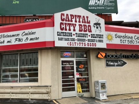 Capital City Barbecue is not in East Lansing, but it’s also not too far, at the corner of W. Saginaw Highway and MLK near St. Lawrence Hospital at 1026 W. Saginaw. It’s open Monday through Friday from 11 a.m. to 8 p.m., and they seem to do a brisk take-out business.