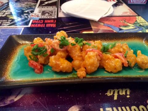 Reader, I was back before the week was out, with Captain Carnivore. That time, I noticed the list of artisanal cheeses hanging over the register. A cheese and fruit board is available as a “Shareable,” along with the Duck Fat Fries, Fried Pickled Veggies, P.E.I Mussels and our selection, Rock Shrimp Tempura. We decided that a couple or a group could make a pretty interesting dinner out of Shareables and an adult beverage or two.