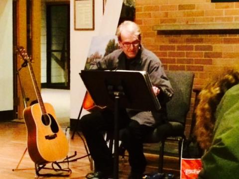 At the front of the Church’s Fireside Room was a couple with an assortment of guitars and a banjo. Because I am a really good eavesdropper, I learned that the usual singing leader Sally Potter was home with a virus. When I struck up a conversation with the two women on my right, I learned that our substitute leaders were Jim Hall and Cindy Morgan of the Grand River Band, a local folk group.