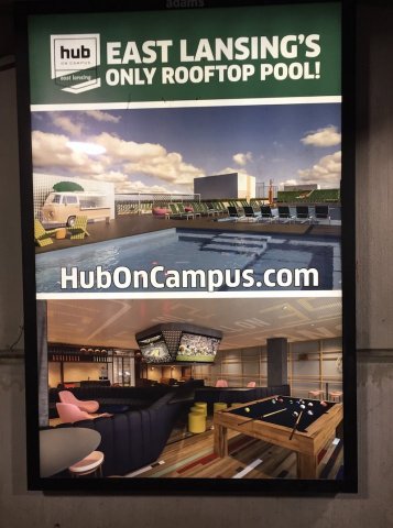Below: An advertisement for The Hub in a downtown City parking garage.