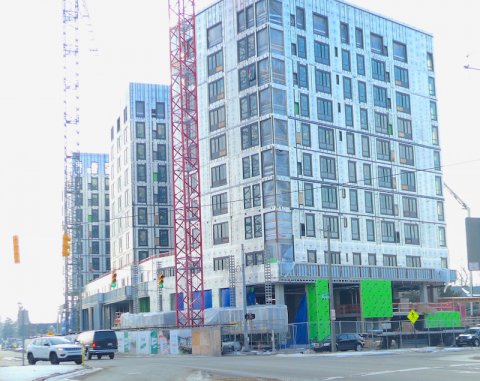 The East Village has a special type of zoning called “form-based code.” That code required the Hub’s very tall first floor retail space now being constructed along Grand River Avenue – retail space that will include the 7-Eleven and Georgio's Pizza locations that were displaced when construction began at that site.
