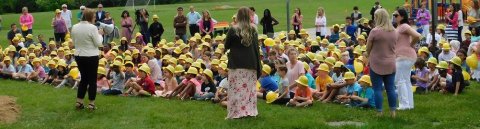 Music teachers Katie Pike (Whitehills) and Cari Cravotta (Pinecrest) led the playground gatherings in song and spirit.
