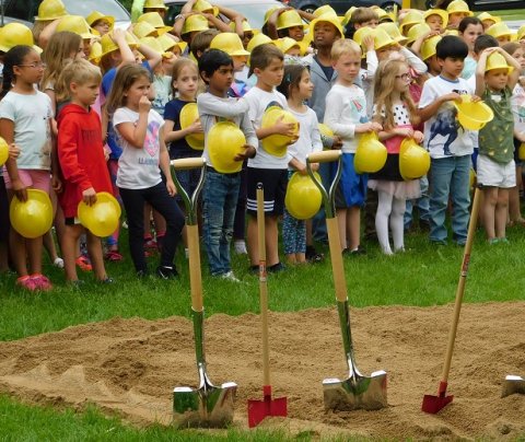 The shovels were digging in, sand was flying, plastic yellow hard hats waving and plenty of cheers filled the afternoon air Tuesday at groundbreakings for new buildings at both Whitehills and Pinecrest elementary schools.