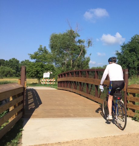 Below: a biker uses a reconstructed bridge along the Northern Tier Trail in Harrison Meadows.