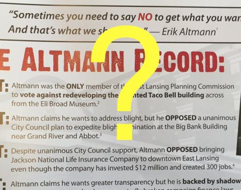 Since the Lansing Regional Chamber of Commerce’s political mailer attacking Council candidate Erik Altmann started arriving in East Lansing mailboxes yesterday, we’ve had a number of readers ask us to check out the “facts” named in the mailer. Here we provide what we’ve been able to find out.