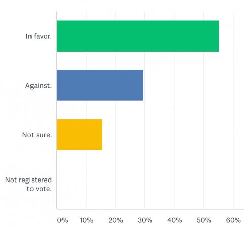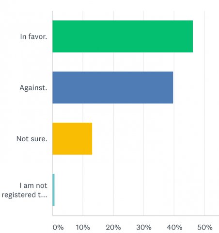 We received a total of 136 responses. Of those, 46% plan to vote in favor of the income tax, and 40% against, as shown above. On the property tax reduction question, 55% of our respondents plan to vote in favor, and 29% against, as shown below. (The property tax reduction will only occur if the income tax passes.)