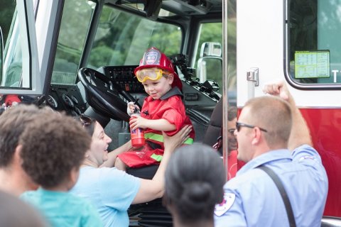 Above: A young attendee tries out the driver's seat of a fire truck.