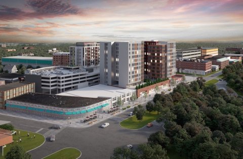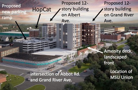 Above: The current design for the Center City District proposal, looking down at the Abbot Road/Grand River Avenue intersection from the southwest (above Mayo Hall).