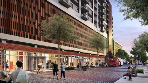 Bell told the Commission that the parking garage along Albert Avenue would be screened with “metal tubes,” and that Albert Avenue would become a welcoming “complete street” space that could be used for festivals. He provided this updated rendering of what the redesigned Albert Avenue would look like: