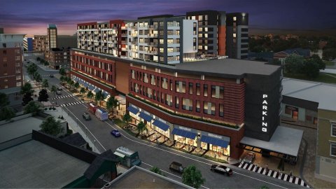 Above: One of the developer's latest renderings of the project, looking down on Albert Avenue at the structure that would replace City lot #1.