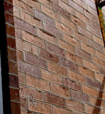 The project was approved without any of the buildings rendered in daylight, so there has been some question about what the surfaces would look like. In the last few days, workers have started installing brick facing on the ground floor, as shown in close-up below. The brick is a rosy tan with a somewhat puckered appearance.