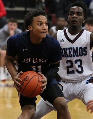 Okemos senior guard Austin Gibson (23) keeps a close eye on East Lansing’s Mason Woods (11). Gibson led all scorers with 25 points.