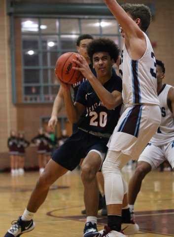 East Lansing sophomore guard Brevin Jackson (20) looks for a way around Okemos senior center Grant Holtzer during Tuesday night’s game. Holtzer made several key defensive plays for the Chiefs, who won 69-51. (Photos by Gary Caldwell)