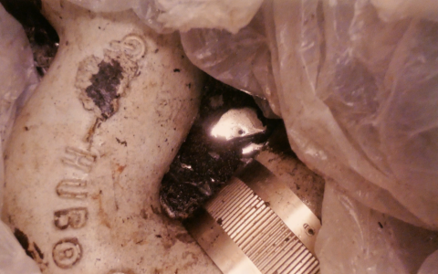 At one point, Williams was ordered to pull the trap from the sink where mercury had spilled. Williams pulled out his phone and took the following photo. He says the trap shown to the left is about 4 inches in external diameter. The shiny material at the center of the photo is the spilled mercury.