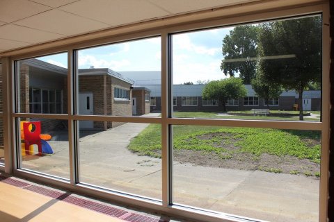 Updates to the Red Cedar building include a new secure entrance off the rerouted circular drive where students can be dropped off by parents. The new front entry features a foyer with a bank of windows (above) looking into an office space which will house administrative staff and Principal Ware’s office. Visitors will have to be buzzed into the building by front desk staff. Classroom doors have also been fitted with a security system, a magnetic “hold open” system which will allow doors to automatically close and lock in the event of a school lock-down.