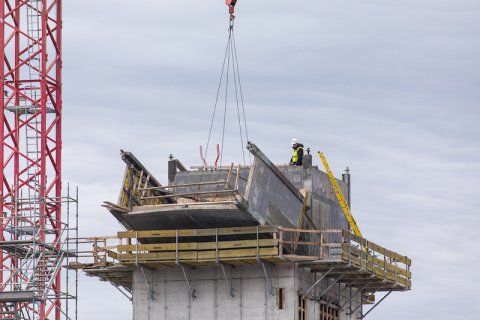 East Lansing Fire Department Captain Leo Allaire tells ELi that at about 2:30 p.m. Tuesday, a construction form shifted during placement on the 11th floor of the project. The form is made out of metal and wood and weighs about 4,000 pounds.