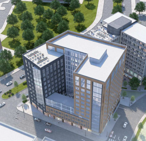 Below shows the building to be constructed at 100 W. Grand River Avenue (known in plans as "Building A"), shown from the air looking southwest (as if you were above Sharp Park), with the intersection of Abbot Road and Grand River Avenue at the left in the image. This is the rendering from the plans that were approved in August 2018: