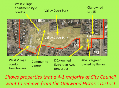 East Lansing’s City Council has voted 4-1 in favor of shrinking the Oakwood Historic District, including by removing all of Valley Court Park. The move comes in preparation for expected redevelopment of properties on Evergreen Avenue and in the park.