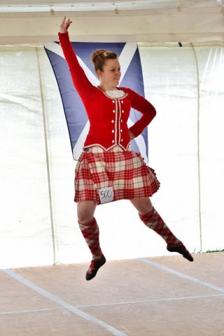 Above: Allie Gibson Murad performs at a recent competition for Scottish Highland Dance wearing her family tartan: Dress Red Buchanan.