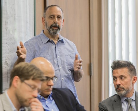 Above: Paul Vlahakis (standing) at today’s meeting with DDA members Jeff Kusler (from left), George Lahanas, and Eric Sudol. (Photos by Raymond Holt)