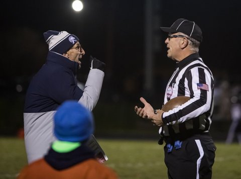 East Lansing head coach Bill Feraco questions why an official’s call midway through the fourth quarter was overruled and ultimately gave possession of the ball to DeWitt.
