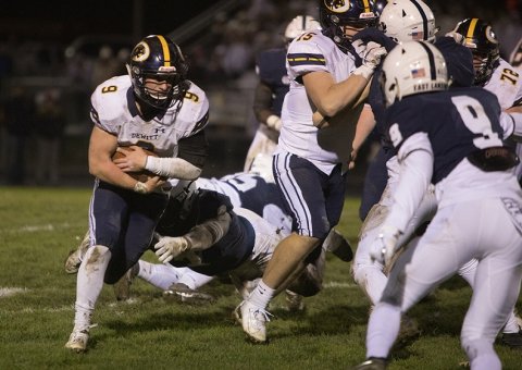DeWitt junior running back Blake Beachnau (9) eludes the grasp of an East Lansing defender while Jesse Vasquez (9) moves in to make the tackle. Beachnau gained 110 yards on 16 carries to lead DeWitt, which finished the game with 309 yards rushing on 58 carries.