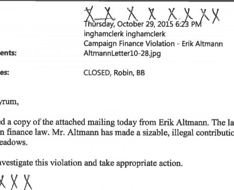 Byrum received the complaint by email on Thursday, October 29, at 6:23 p.m. The message was short, referring to Altmann’s letter and claiming a “blatant violation” on the part of Altmann for recommending votes for Meadows and Ross.