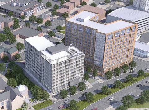Below: The Graduate hotel rendered to the left, with The Abbot to the right. Peoples Church is to the far left.