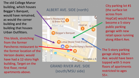 Plans for the Center City District had called for a new parking garage on City parking Lot #1 with new retail space along Albert Avenue and five stories of senior rental apartments above the garage (shown above). Along Grand River Avenue, using privately-owned land now housing vacant commercial buildings, the developers had planned to build a twelve-story building with a smaller-format Target store on the ground floor and market rate rental apartments above.