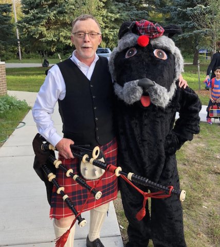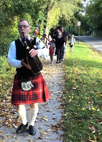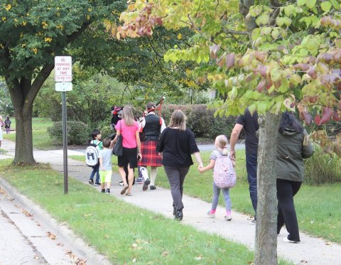School Principal Lorraine Ware, several teachers and members of the fifth-grade safety squad were also on hand to help with smaller kids, as well as acting as crossing guards at intersections. Scotty lead the procession, followed by the kilt-wearing bagpiper.