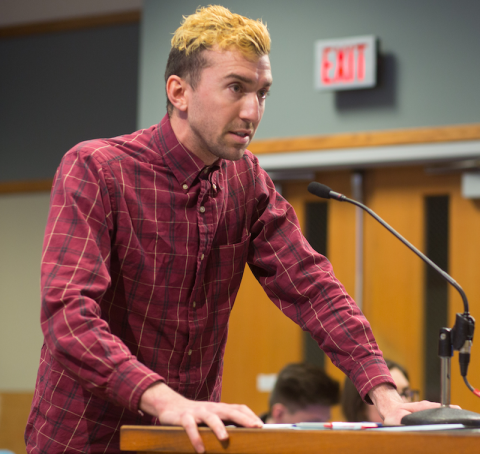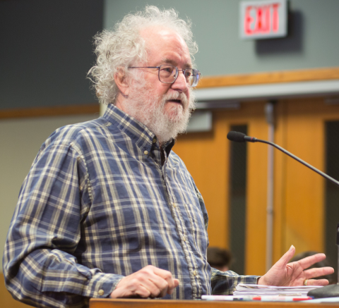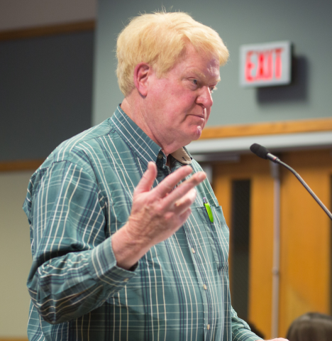 Above: Curtis Vollman urges Council not to vote to kill deer (photo by Raymond Holt)