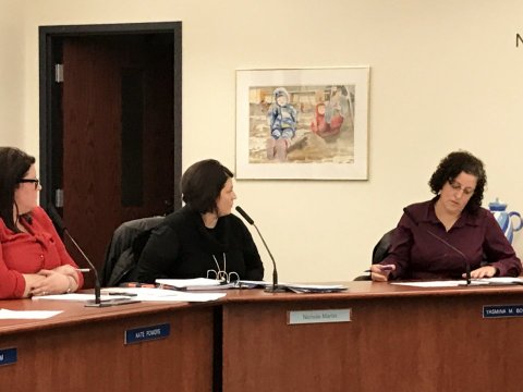 Above: Newly elected Trustee Nichole Martin (center) explains her "no" vote on the school bond proposal motion.