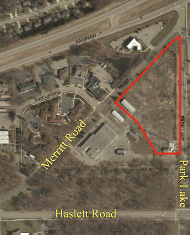 The property, on Merritt Road near the East Lansing Costco store, is the former site of the Department of Public Works (DPW), and is marked below in red. An offer of sale on the property was put on eBay by Planning Director Tim Dempsey early this year, with no other public announcement and little transparency since.