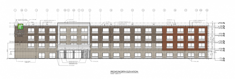 The hotel, outlined in orange, is designed to be four-story Holiday Inn Express with 107 hotel rooms. All amenities and office space, as well as some hotel rooms, will be on the first floor. The remaining three floors will be exclusively hotel rooms. The rendering provided shows this: