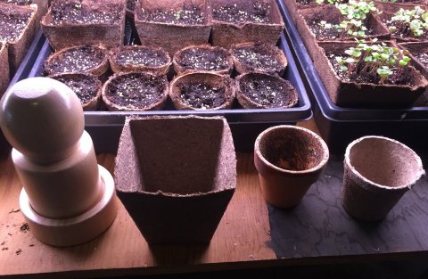 Photo below: From left, a paper pot-making mold, a 2-inch square peat pot, a 1-inch terracotta pot, and a 1-inch round peat pot. The author has used all of these to successfully start seeds in East Lansing under grow-lights.
