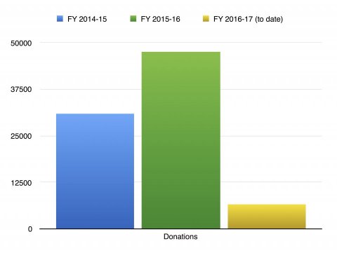 To date, we have operated entirely on donated money and donated labor. In our first fiscal year, which ran July 1, 2014 through June 30, 2015 we obtained $30,842 in financial donations. (See our report about our first fiscal year.) In our second fiscal year, which ended June 30, 2016, we obtained $47,526 in financial donations.