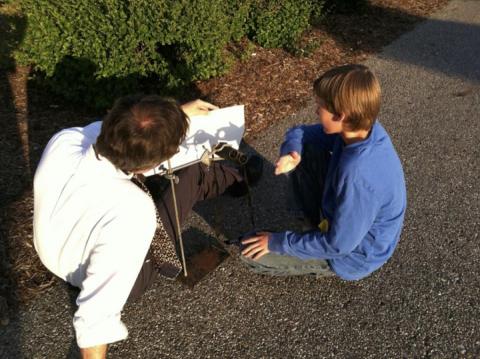 First, let’s look at how to build a solar telescope from a pair of binoculars. (You are NOT going to look through the binoculars at the sun!) In the picture shown above, taken at the Hannah Community Center, an area man and his son used binoculars plus an old chemistry stand and clamps to make a sun telescope in order to view the transit of Venus across the sun on June 5, 2012. (A detailed close-up is shown below. The boy is helping to shade the system to improve visiblity of the projection.) The design for this kind of sun telescope is straightforward: