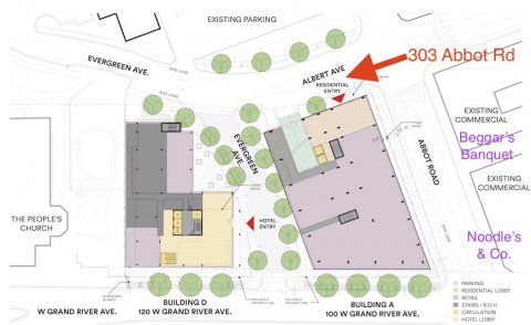 The lease of the land can be terminated with 50 days’ notice, which will happen if the Park District project finally takes off. ELi reported on Friday that new plans have now been submitted for that major redevelopment. The image below shows the proposed new buildings at the now-vacant Park District site along with the location of 303 Abbot Road, which is proposed under the new plan to be used in part for straightening Albert Avenue across Abbot Road and in part for the land of "Building A" (a proposed 12-story, mixed-use building) at the Park District site.