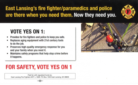 East Lansing firefighters have been knocking on doors to urge a “yes” vote on the proposed City income tax, telling voters, “East Lansing’s fire fighter/paramedics and police are there when you need them. Now they need you.” But the group’s literature may be confusing voters, and County Clerk Barb Byrum has had to inform them they have been in violation of Michigan’s Campaign Finance Act.
