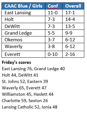 East Lansing has a half-game lead on Okemos (9-1 CAAC Blue), which had the night off. The Chieftains close out their portion of the league schedule with away games at Everett (Tuesday) and DeWitt (Friday). Everett sits in third place in the league with a 5-4 record.