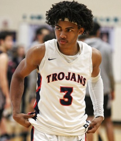 Andrel Anthony Jr. scored 16 points and saved one of his high-flying dunks for the fourth quarter Friday night as the Trojans raised their record to 15-1 and moved one step closer to a league title. (Photo by Gary Caldwell)