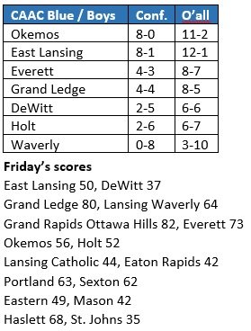 Trojan boys maintain perfect home mark: East Lansing extended its home winning streak to seven with a 50-37 victory over DeWitt. Junior guards Andrel Anthony Jr. and Marcus Wourman Jr. combined for 29 points to help the Trojans improve their overall record to 12-1, 8-1 in the CAAC Blue. East Lansing trails league leader Okemos (11-2 overall, 8-0 CAAC Blue) by a half-game in the standings.